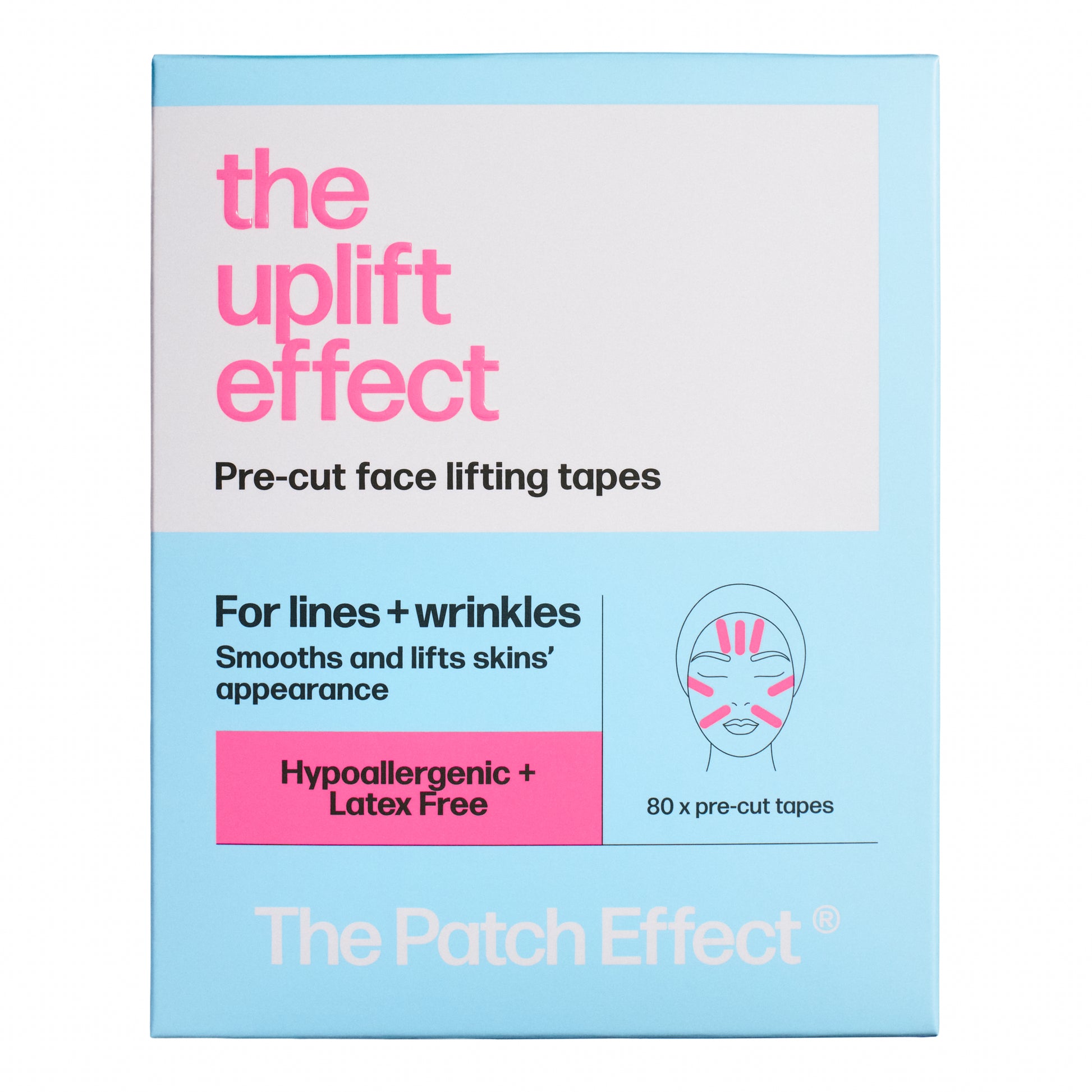 Defy the effects of gravity, gracefully. The Uplift Effect pre-cut lifting tapes are designed to help visibly smooth and lift the look of skin over time, supporting a more refined, contoured appearance. Made from a breathable cotton spandex blend with hypoallergenic, latex free adhesive, these water and sweat resistant tapes are comfortable to wear and easy to apply. Their gentle stretch works to promote a smoother complexion, helping you reveal a fresher, more revitalised look with every use.